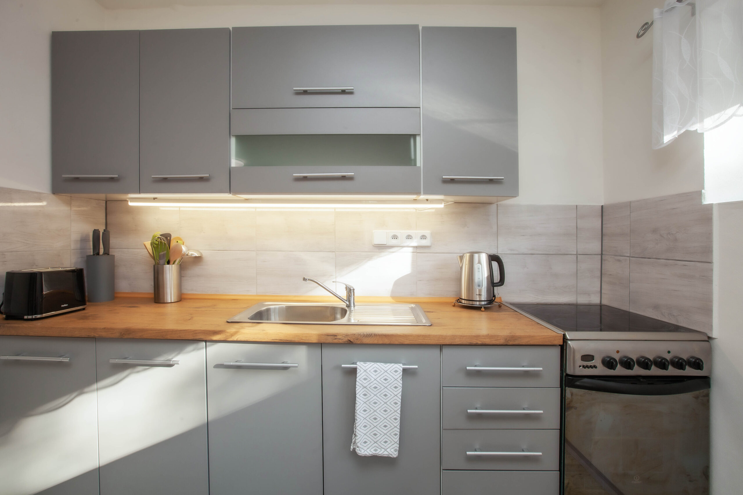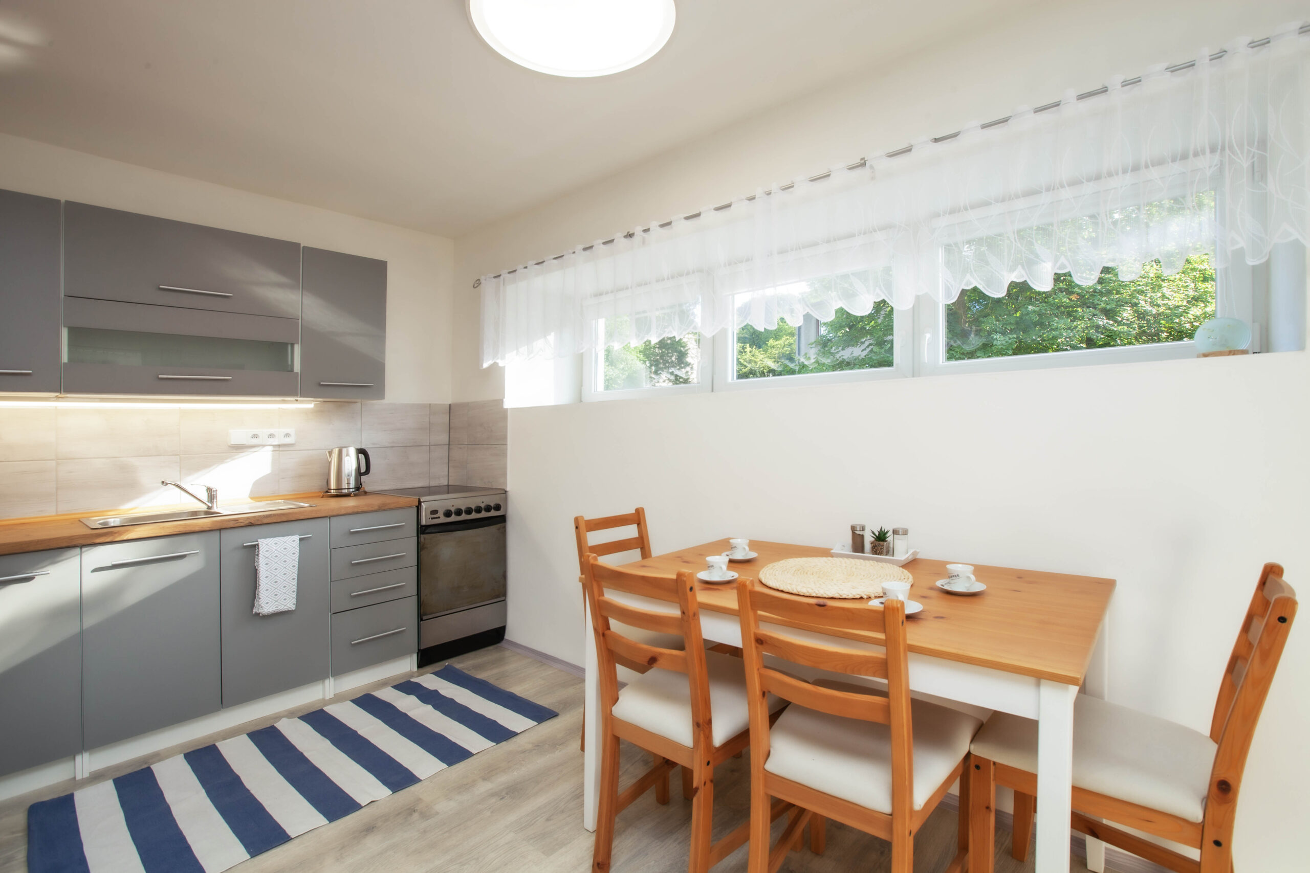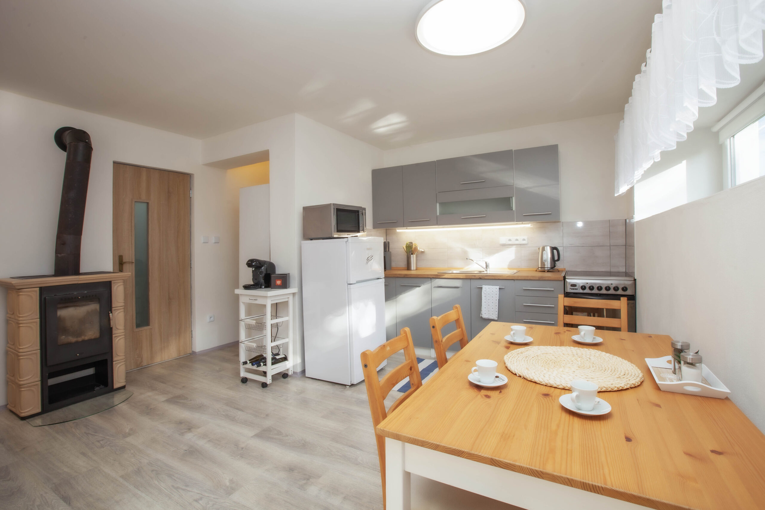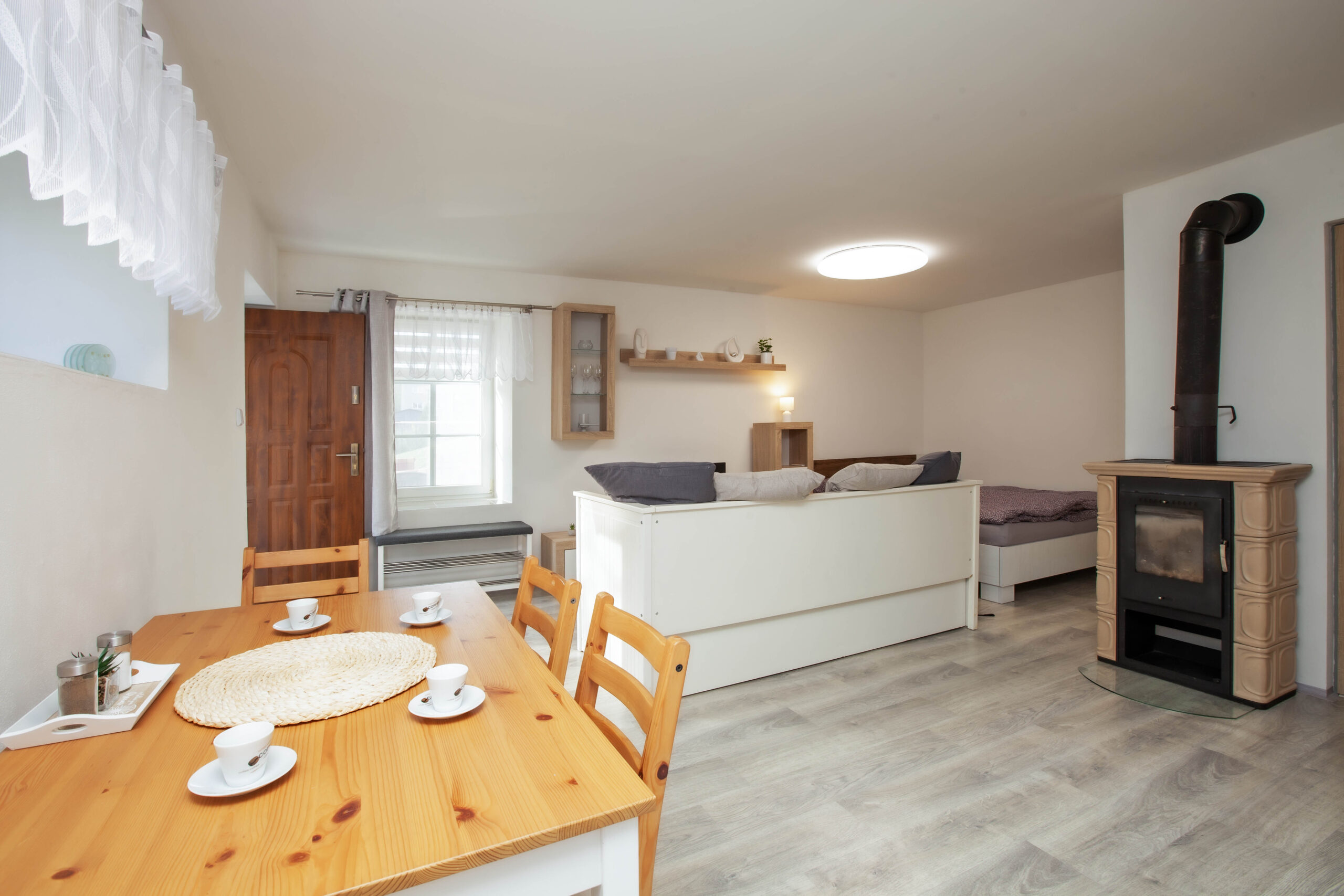 Nabízí ubytování až pro 4 osoby na pevném dvoulůžku a rozkládací přistýlce pro dvě osoby. Je umístěn v přízemí objektu a může se tak chlubit téměř bezbariérovým přístupem. Apartmán se skládá z jedné větší místnosti s kuchyňskou částí a dále koupelny vybavené sprchovým koutem s toaletou. Kuchyňská část je dostatečně vybavená i pro větší přípravu pokrmů; disponuje elektrickou troubou se sklokeramickou varnou deskou, topinkovačem, rychlovarnou konvicí, lednicí s mrazákem a kapslovým kávovarem (Bosch Tassimo). V kuchyni je dostatek nádobí zahrnující veškeré standardní vybavení (hrnce, pánve, jídelní servis a další). Na terase je možnost využití plynového grilu.